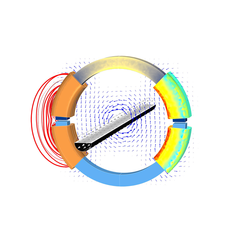 One time-consuming aspect of IT&S design is the conversion between a nonlinear magnetic B-H curve (DC magnetization) and equivalent AC effective H-B curve. ABB used an example application from the Application Library to perform these calculations. After finding the effective H-B curve with the application, they used the value to model the magnetic core of the split-core current sensor. They found that the magnetic permeability is almost linear throughout the entire core because of the decrease in magnetic flux density. Based on these results, the team concluded that homogenous anisotropic conductivity and permeability should be used.